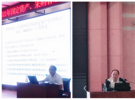 首先,由姜家雄副校长介绍本次培训的必要性,并提出具体要求:一是要求各学院、部门应高度重视采购、固定资产、房产管理工作,提高学校资金使用效益和政府采购效率,合理配置固定资产,保障和促进学校各项事业的健康发展,二是要求相关工作人员必须认真学习本次培训内容,按照管理系统操作流程规范管理,随后,国有资产管理办公室主任普朝龙、副主任史云东分别对《玉溪师范学院固定资产管理暂行办法(暂行)》、《玉溪师范学院采购管理办法(暂行)》进行解读。