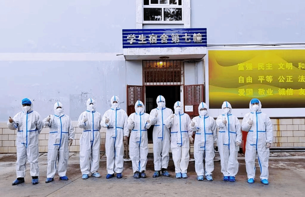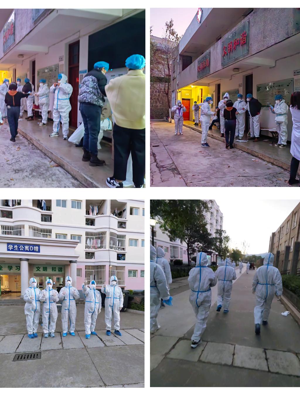 “谁还没有口罩,谁还没有防护服,脚套都有了吗”这是李石屏书记在学校医务室门口前主动承担的现场分发防护服、医用口罩、手套的任务,其他同志也在相互帮忙整理穿好防护服,整个现场充满了团结和友爱。