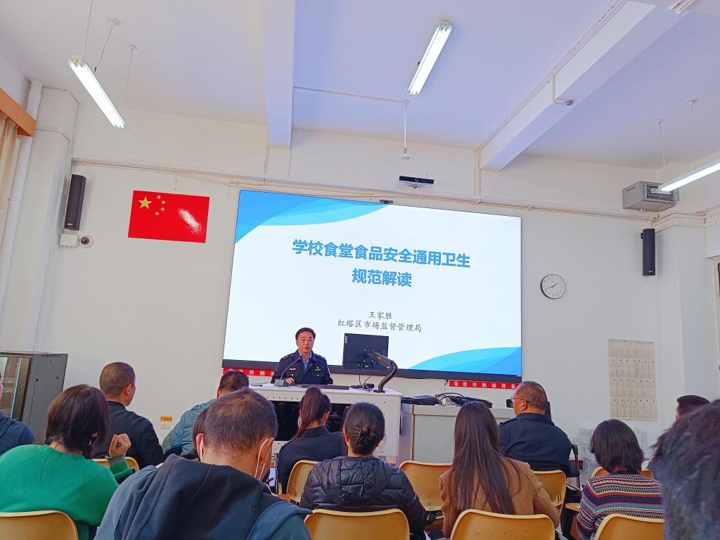 玉溪市市场监督管理局餐饮科科长刘涛、红塔区市场监督管理局凤凰管理所所长王家胜分别以从业人员管理、进货查验记录、食品贮存、烹饪加工相关要求、如何把控学校餐饮食品安全关键环节及学校食堂食品安全通用卫生规范、《企业落实食品安全主体责任监督管理规定》等内容为重点向参训人员进行详细讲解。