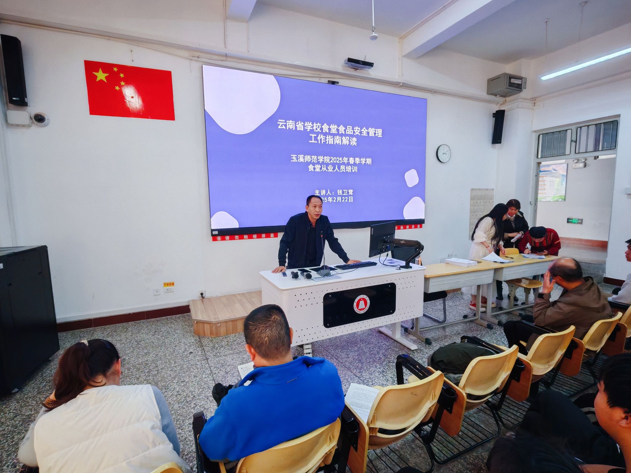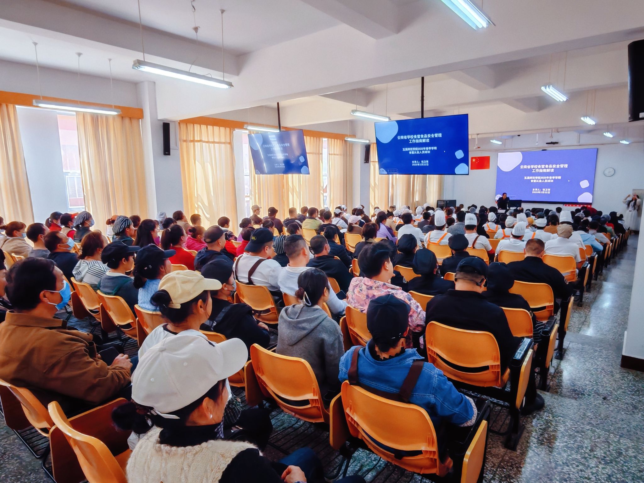 2月22日下午,玉溪师范学院学生食堂管理部门资产经营有限公司,在第十四教学楼多功能教室组织召开2025年春季学期食堂从业人员专题培训会。学校食品安全总监、资产经营有限公司餐饮项目部主任钱卫茸担任主讲人,资产经营有限公司总经理王永、副总经理仲一卉出席并讲话,餐饮项目部全体成员及全校200余名食堂从业人员参与培训。