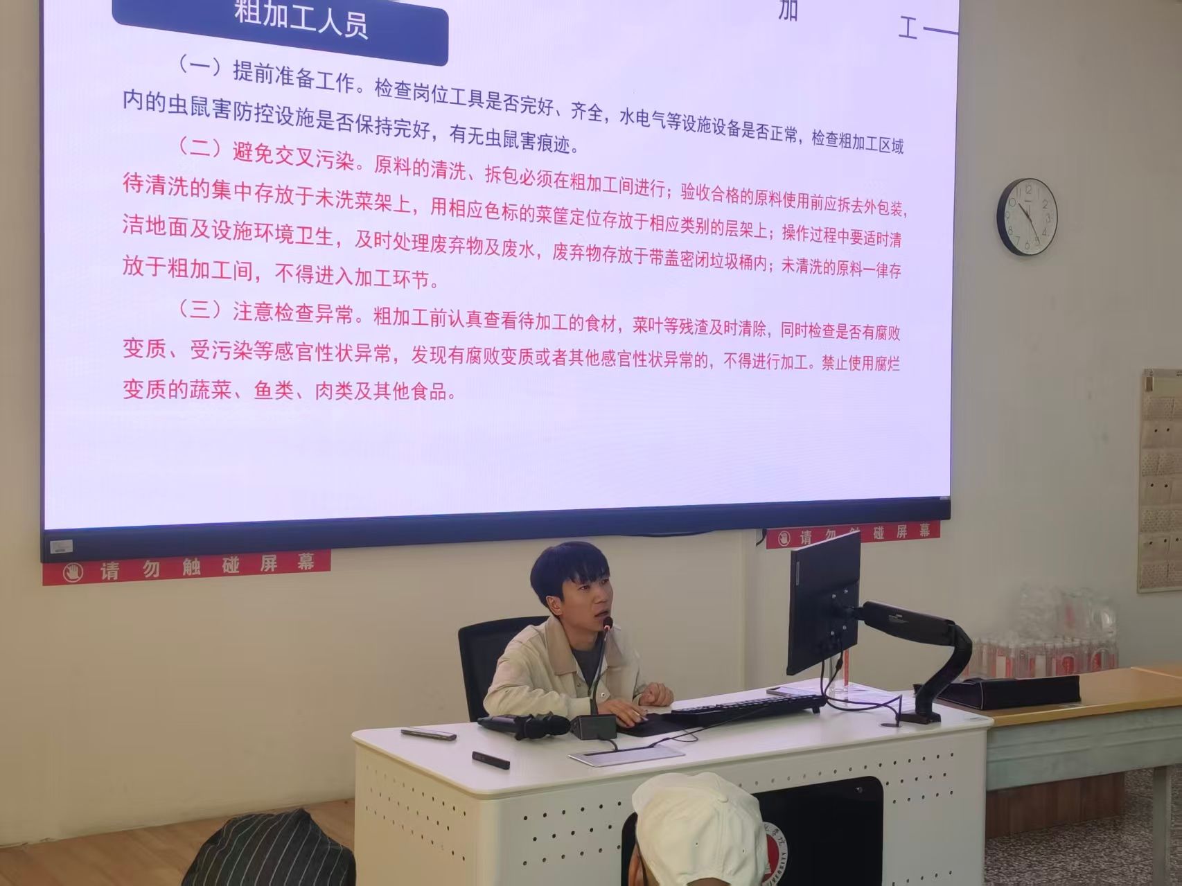 张松结合学校学生食堂安全管理实际,案例分享。围绕从业人员健康管理、食材采购验收、仓库贮存、加工切配、烹饪制作、餐具洗消、食品留样、设施设备使用维护等进行了详细讲解,深入剖析如何防范食品加工制作过程中的食品安全风险隐患,对食堂从业人员日常操作规范做工作要求。