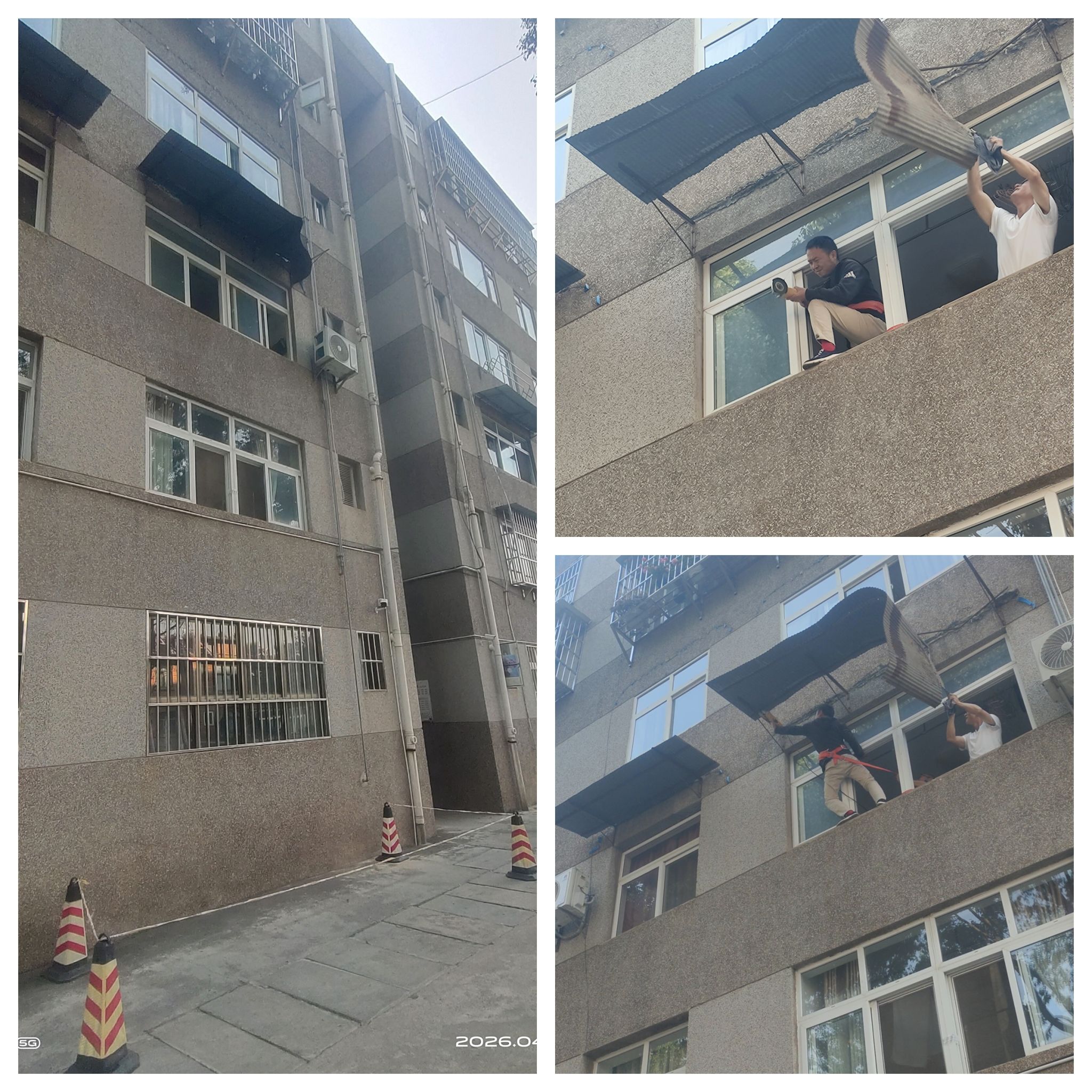 近期春季大风频发,物业部门聚焦校园生活区安全,全面强化安全巡查工作,严防安全事故发生。重点排查各幢楼顶太阳能、空调外挂机、窗户雨棚等生活设施及外墙易脱落的附着物,力求隐患早发现、早处置。期间,某一住户的窗户雨棚被大风撕裂,物业部门第一时间联动学校保卫队,在危险区域设置警戒线,做好现场防护,经业主同意后立即拆除雨棚,消除安全隐患。