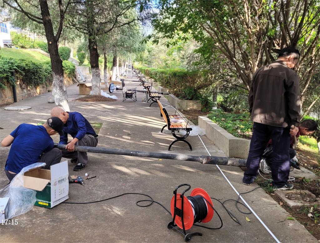 2. 拟定地理与国土工程学院第五、六教学楼及智慧安防机房消防电力改造工程项目方案;排查检修传习馆后方挡墙漏水点、学生公寓M幢后方挡墙绿地内漏水供水管;更新安装三元楼、第四教学楼存在安全隐患的2个老旧分电箱;加装第七教学楼前新配座椅旁9盏路灯。