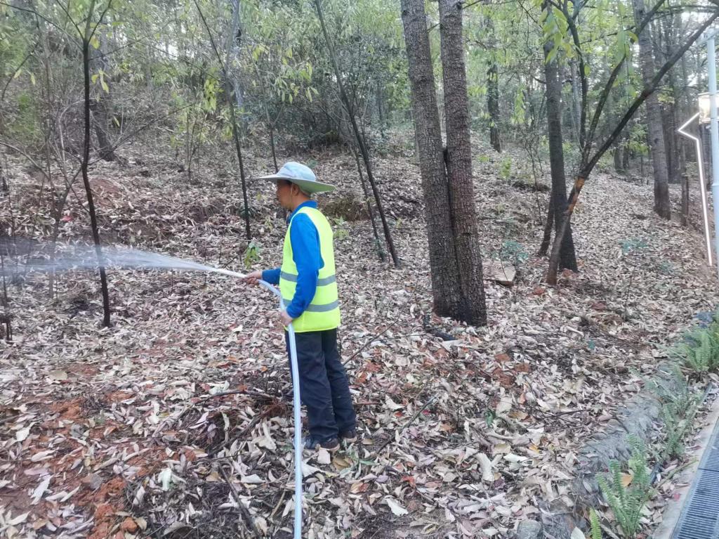 1.针对近期降雨持续偏少、风力较大、气温回升,强化火险防范隐患排查工作。通过加大山林火源管控力度,清理自然山林步道两侧、排水沟枯枝落叶以及林内紫茎泽兰杂草和易燃垃圾杂物,配置护林防火标识牌、垃圾桶、消防储水桶,喷水浇灌山林及步道沿线增加林内湿度,加强护林防火巡查巡护密度,提醒告知林区吸烟者防范火灾隐患风险等措施,重点开展山林火险防范应对工作。