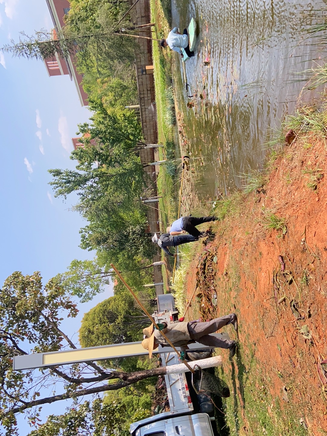 3.修剪医务室、学生宿舍7幢宿舍门前、二教片区三角梅,西门片区、品味苑周边树木,十三、十四教绿植,东门、东北门及美术学院周边草坪和绿篱;打捞山顶悠悠湖、博思湖睡莲;第一办公区摆放盆花布置景观;改造7教周边部分绿地,补栽花苗;对东门道路两侧石楠进行病虫害防治;对教学区景观主线绿植进行施肥;修剪后山山顶、品味苑周边、教学区景观线的草坪;清除龙马公寓至东门围栏内、地海周边、滋味苑周边杂草及绿化带内落叶。