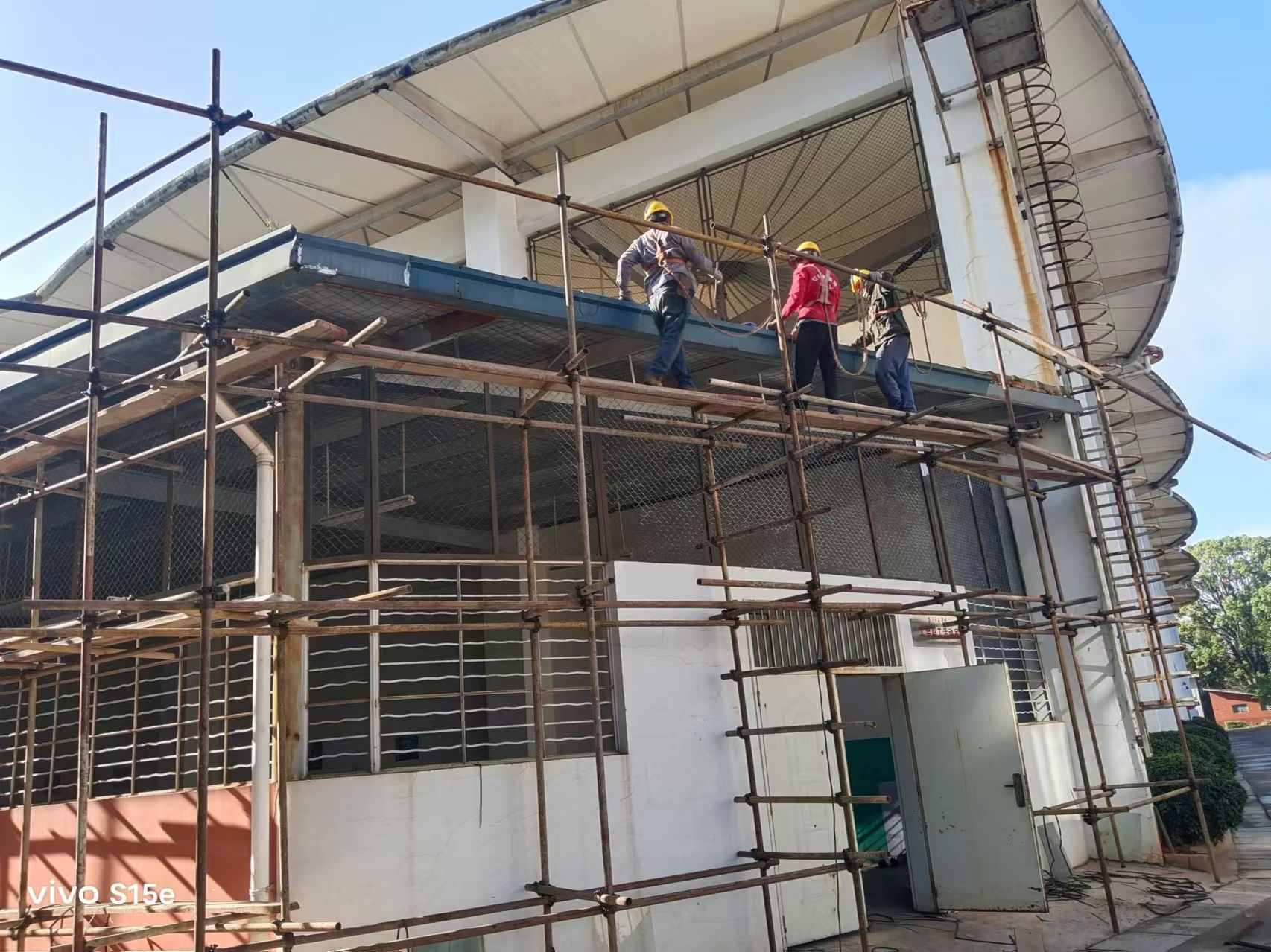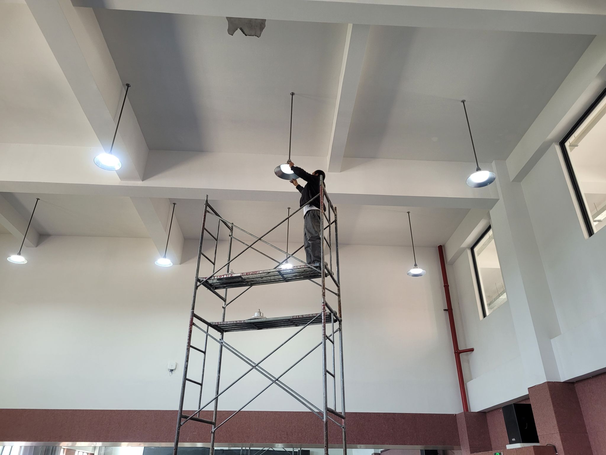 3.对全校配电室开展巡检工作,配合红塔区供电局开展11-14教学楼配电室清理整治工作;调整塑胶篮球场开灯时间;检修更换学校公共区域路灯20余盏;安装2幢前公共路灯时控开关;安装化生环学院实验室大功率实验设备电箱及布设电源线;搭设足球场主席台电源;完成长安楼、专家公寓、传习馆、实训大楼、美术学院、音乐演播厅、舞蹈楼教室、三元楼、五教、六教、东门值班室、风雨馆琴房、实训大楼配电室、山顶玻璃房灯具故障、水管破损、电源故障等水电零星修缮30余项。