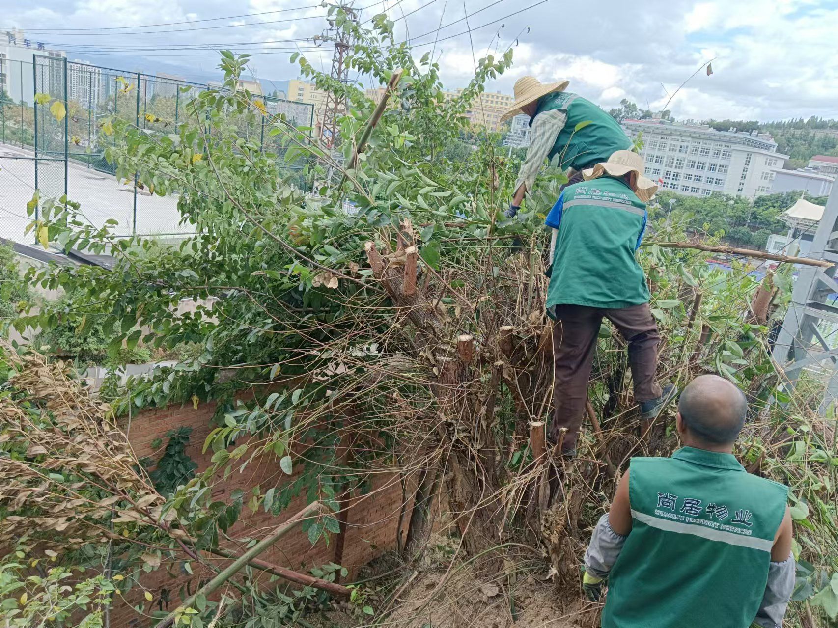2.开展校园公共区域绿篱、草坪养护工作。清除杂草、枯枝,清运绿化垃圾5车,施肥0.8吨;利用育苗基地做好花苗培育和苗木养护;清理地海、东北门至龙马公寓高压塔架周边的树木枝条、杂草;修剪长安楼、学生公寓遮挡摄像头的树木枝条;完成东门至长安楼、地海竹林至美术学院、东北门自然林区病虫害防治工作。