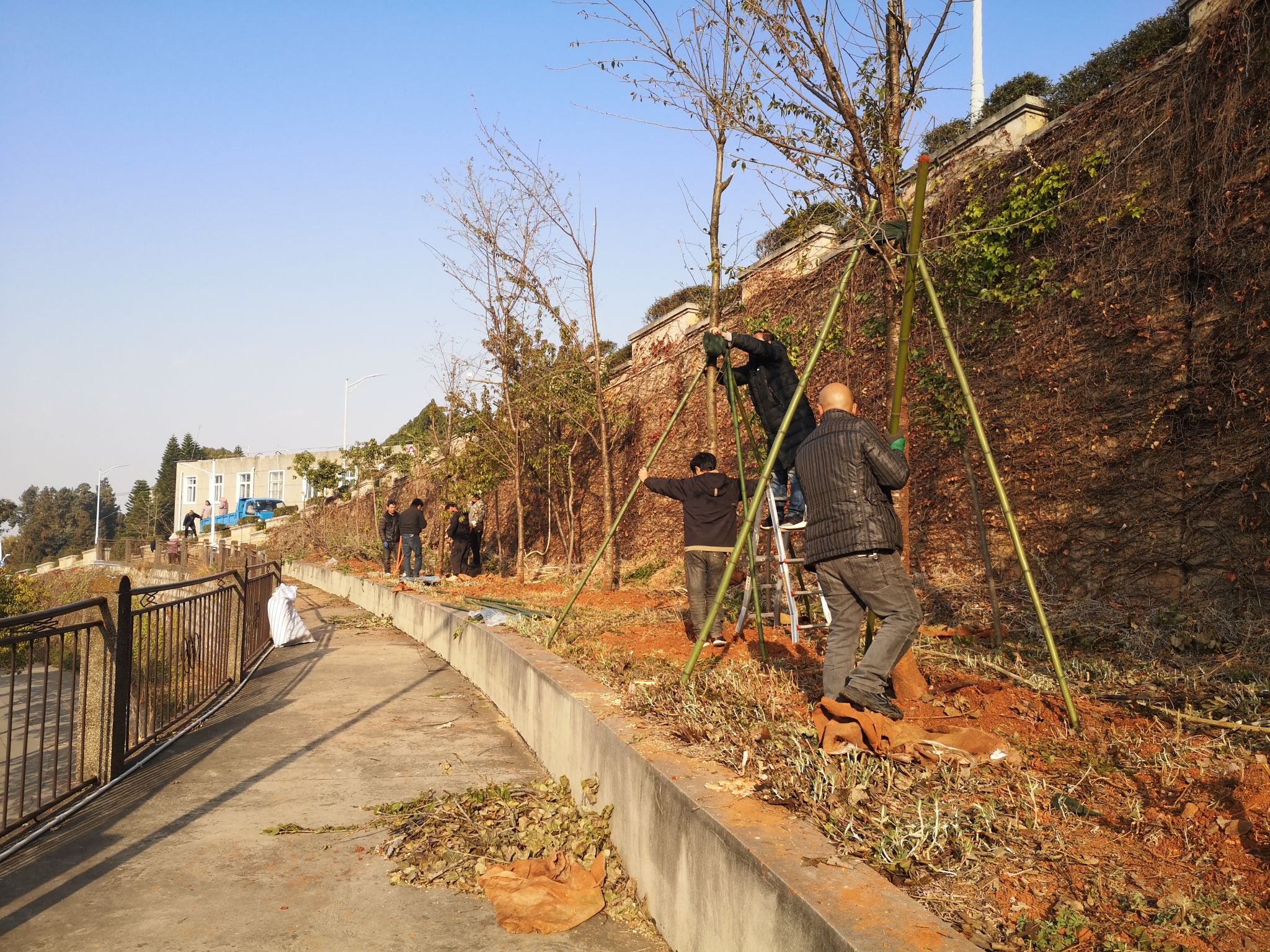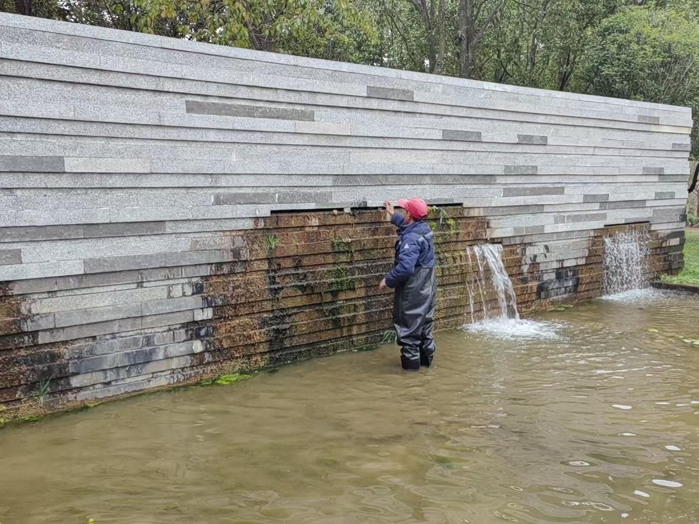 6.加强山林巡视,检查防火标识,更换防火公告,及时给消防水桶、垃圾桶储水缸补水,清扫步道两侧枯枝落叶,清掏山林排水沟,步道两侧浇水增湿,持续做好山林防火工作;检查抽水房设施设备、水体周边护栏完好,未发现破损,警示标识齐全,救生圈配备完整;清理水体杂物,清理排水口滤网,保证溢水口、排水口管网畅通,合理计划绿化用水,做好抗旱工作;对建筑物周边坡挡墙等进行安全排查,无明显滑坡迹象;清扫教学楼、办公楼楼顶垃圾,清除杂草及疏通排水口堵塞物,及时清扫积水,保证楼顶排水畅通。