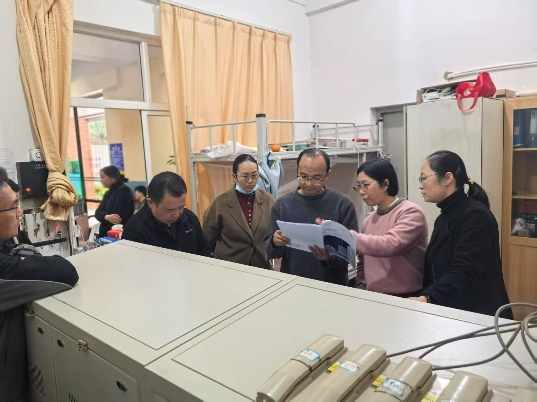 3.开展学生宿舍各楼幢零星修缮;配合学生处完成A、B、C、D幢活动室一站式建设改造;清洗学生宿舍饮水机、4幢学生宿舍窗帘;统计龙马公寓H幢四人间更换家具。