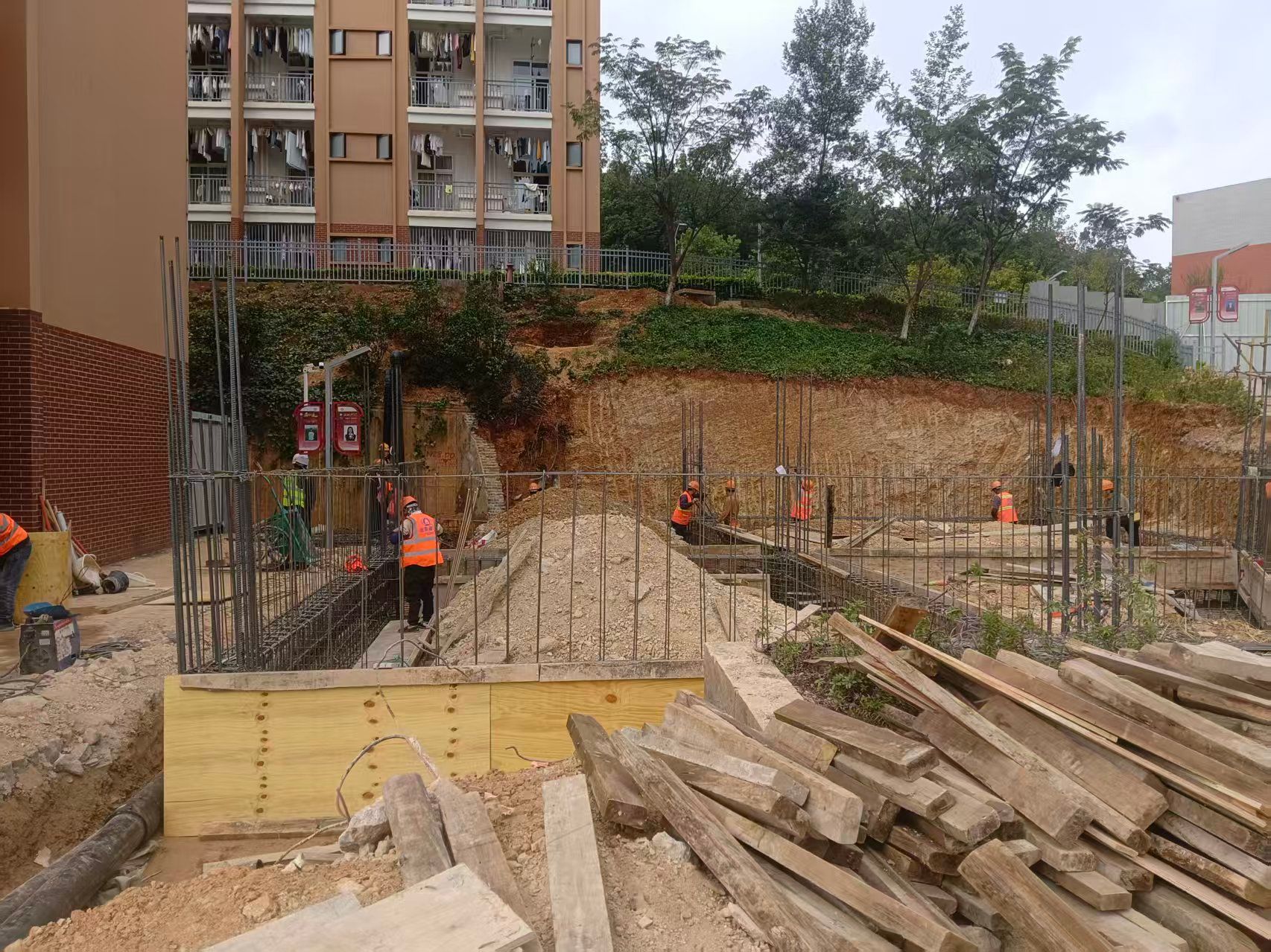 4.完成施工区域围挡布置;1﹟配电室、2﹟配电室测量放样,1号配电室基础砼垫层浇筑;O、P幢试桩施工,P栋现有挡土墙位置给水管改迁施工。
