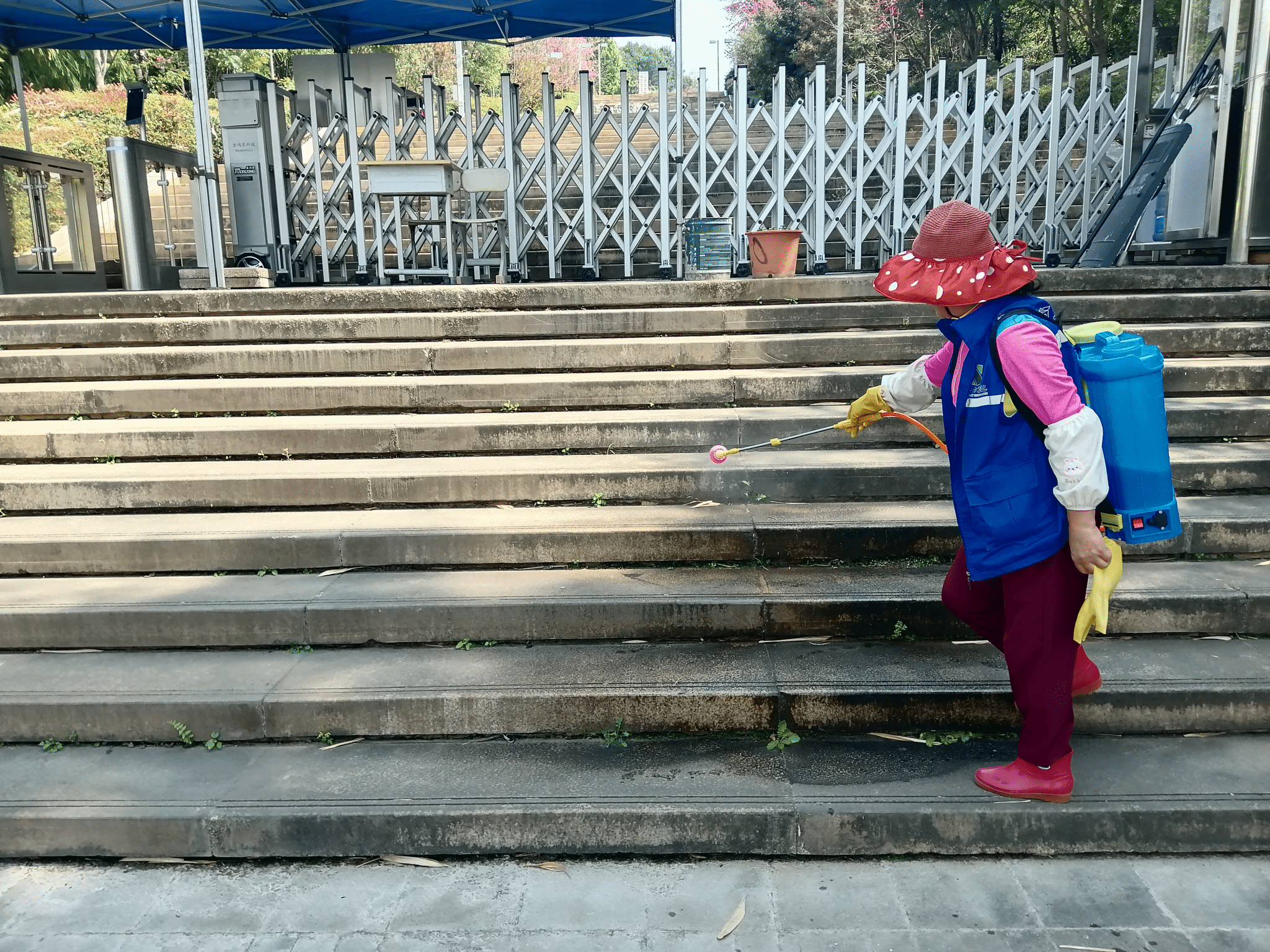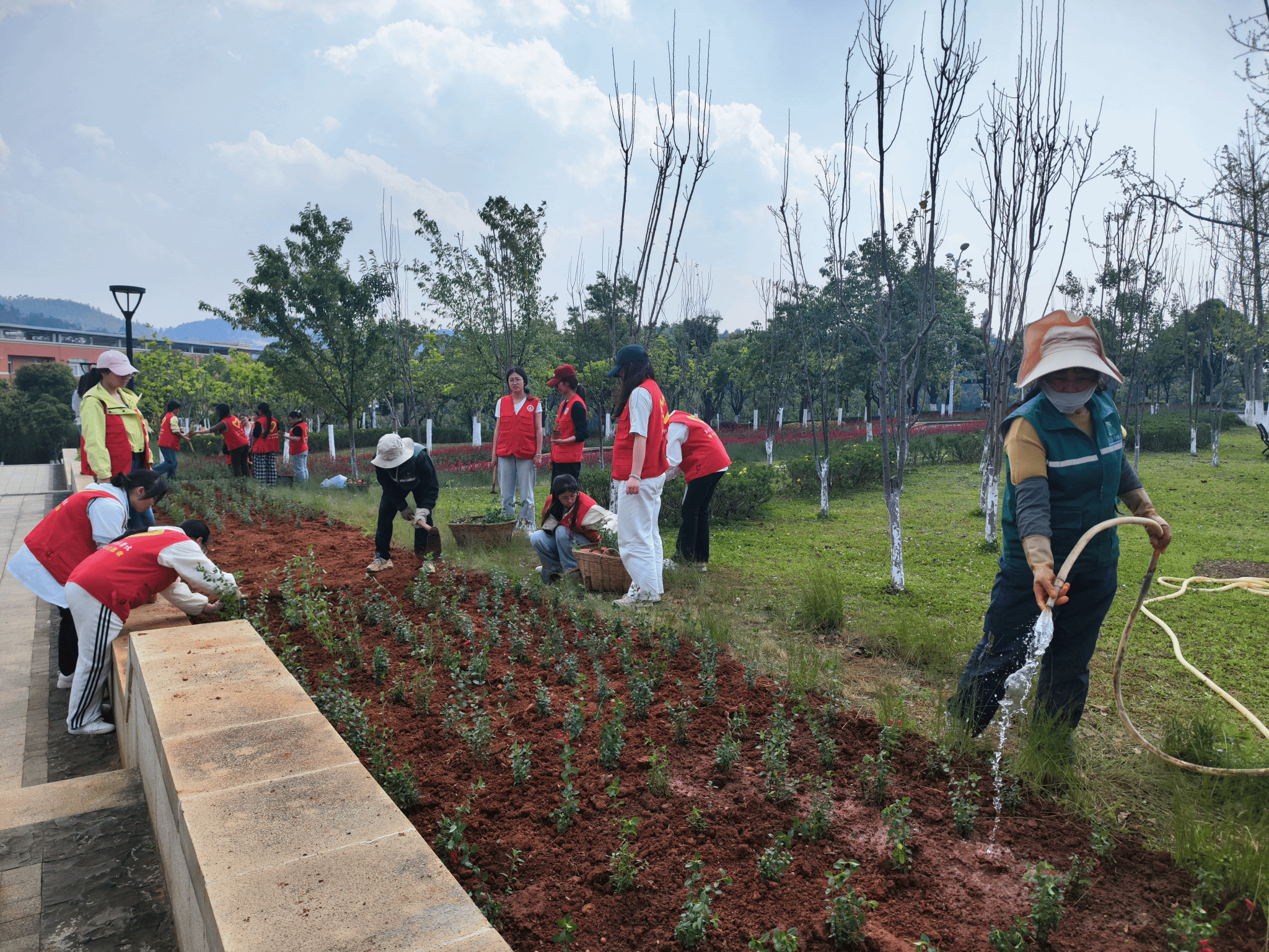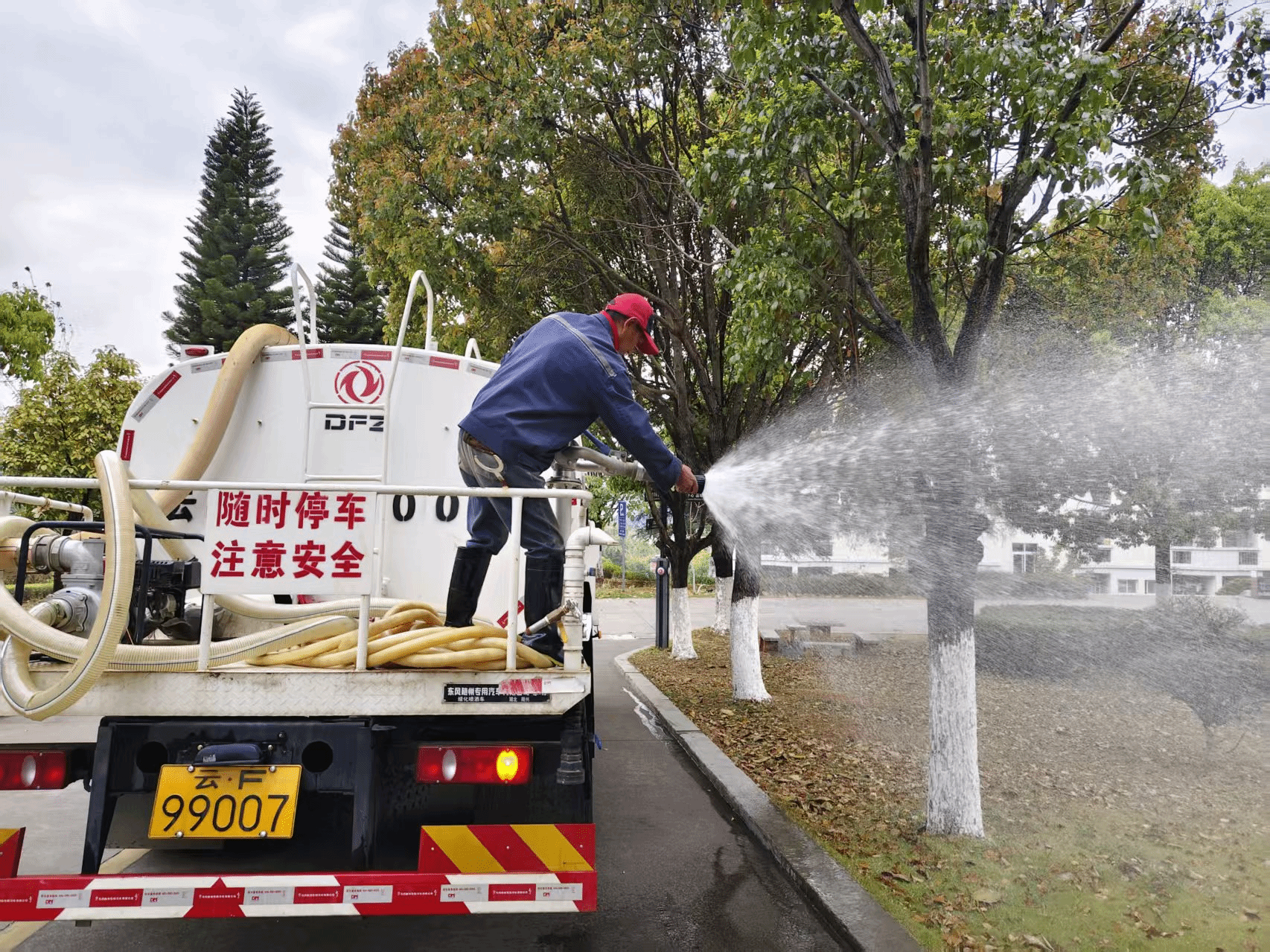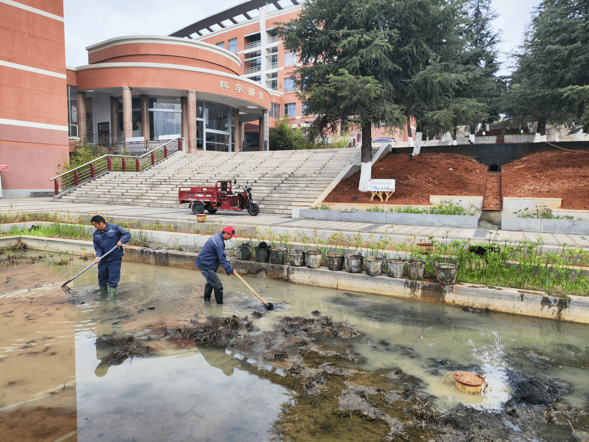 2.做好校园绿化日常修剪养护工作,完成砚池柳树、紫藤、天竺葵修剪、施肥、补植;完成龙马公寓与技校接壤处杂草及教职工宿舍6、8幢前水池淤泥清理;山水东路樱花树下草坪补种;山顶水景墙前花卉苗木、医务室西侧千层金更换;半亩方塘欧洲荚蒾、2教前常春藤补植;田径场门口校徽环岛鲜花摆放;完成银杏林、怡心潭及校园3个环岛草坪修剪;根据天气情况及绿化长势进行病虫害防治、红火蚁消杀;清运绿化垃圾15车次,洒水车作业10车次,绿化施肥310㎏;联合工会、青年志愿者协会师生在艺术楼中轴线开展活动。
