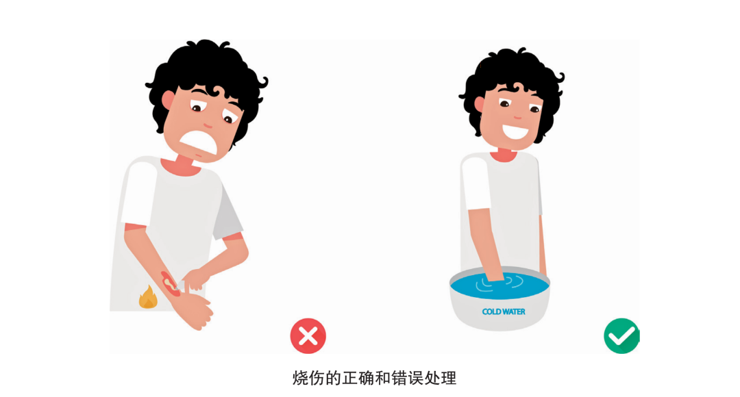 ☐ 立即用冷水对伤处进行冲洗,等冷却后再小心地将贴身衣服脱去,以免撕破烫伤后形成的水疱。面部等不能冲洗的部位可用冷敷,用湿毛巾或湿床单盖在伤处,不要弄破水疱。冷水冲洗的目的是止痛、减少渗出和肿胀,从而避免或减少水疱形成。
