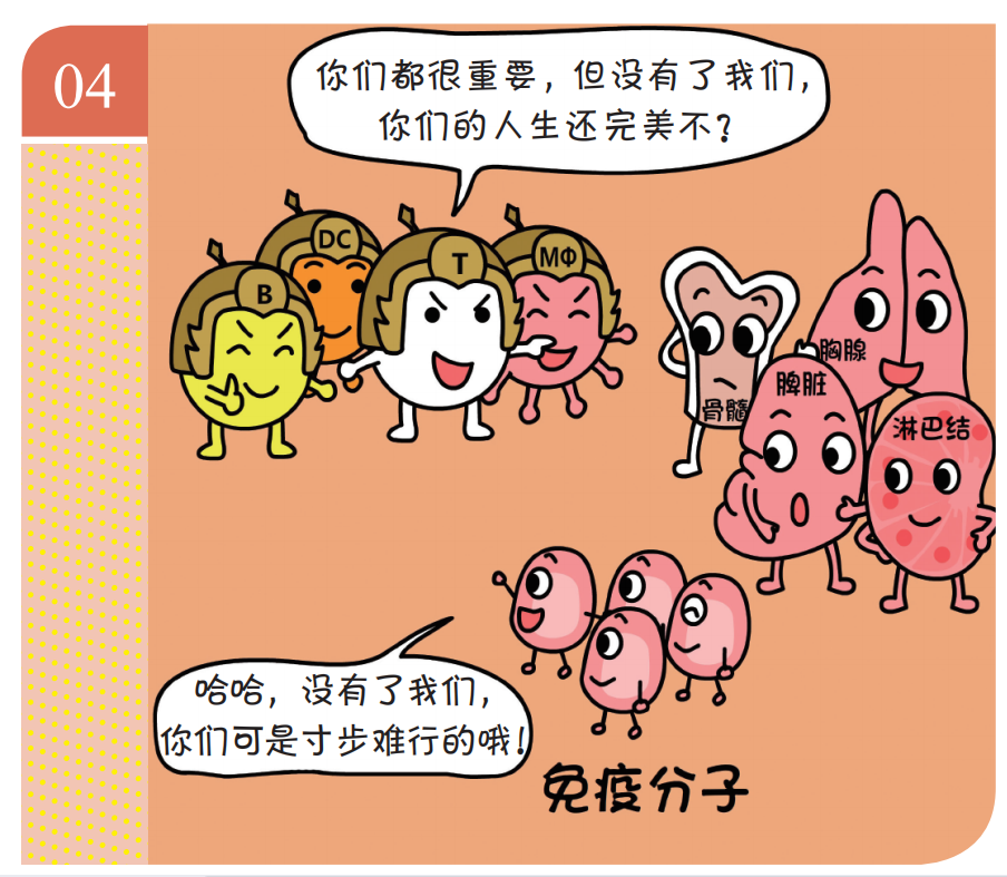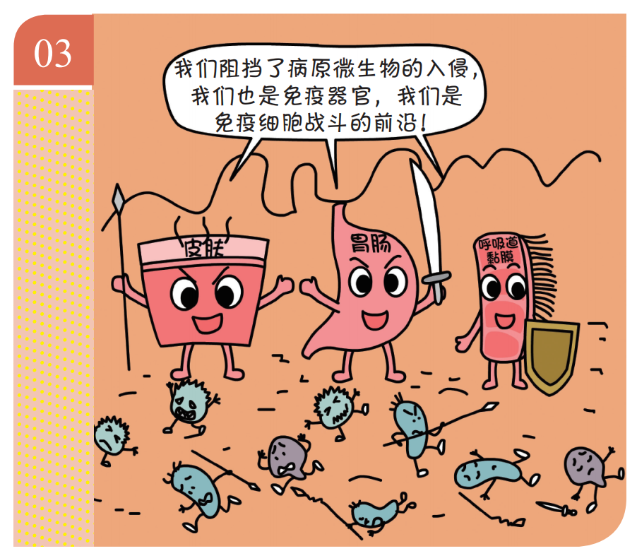 机体的免疫系统同呼吸系统、消化系同等一样重要,是捍卫我们身体健康的部队,包含了免疫器官、免疫组织、免疫细胞和免疫分子。免疫器官可分为中枢免疫器官(胸腺和骨髓)和外周免疫器官(淋巴结、脾脏、扁桃体等);免疫组织除了存在于包膜化的免疫器官外,在肠道、呼吸道和泌尿生殖道等黏膜下含有大量非包膜化的弥散性淋巴组织,为免疫细胞提供了定居和发挥作用的场所;存在于免疫器官和免疫组织中的免疫细胞和免疫分子,则是这支部队里的官兵。