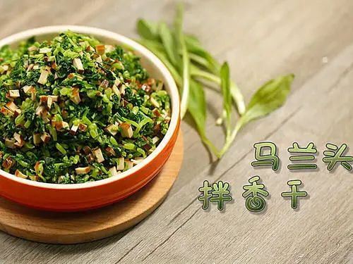 材料:马兰头300克、香干100克,盐3克、白砂糖5克、香油10克。