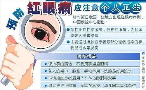 俗称“红眼病”,它是一种常见的眼部感染,是由病毒引起的累及眼结膜的急性炎症,也是世界范围内流行性的传染性眼病,其特点为潜伏期短(一般为12-48小时)、传染性强、传播快、起病急、接触传染、人群普遍易感、易造成大范围爆发流行,为我国法定丙类传染病。