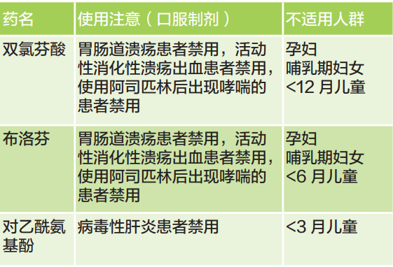 这些药属于解热镇痛抗炎药,这类药物解热镇痛疗效明显可靠,是缓解牙痛症状的常用药物,这类药物对临床常见的慢性钝痛、牙痛、痛经及产后疼痛等都具有良好的镇痛效果。其使用注意和不适用人群见下表。