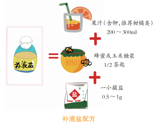 补充电解质可以饮电解质饮料,若无口服补液盐可自己调配,做法如下:将果汁(含钾)与 1/2 茶匙的蜂蜜或玉米糖浆(含葡萄糖)以及一撮食盐均匀混合即可。