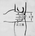 取穴:足三里穴位于外膝眼(膝盖最外侧的凹陷)下三寸(除拇指外四横指并拢的长度)。