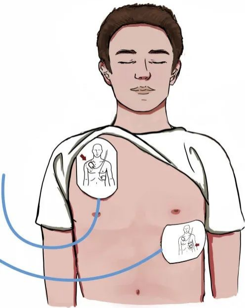 成人/8岁及以上儿童标准位置:一片电极片贴于胸骨右缘、右锁骨下方(右上胸),另一片贴于左乳头外侧、左腋前线第五肋间(左胸下侧),电极片需完全贴合皮肤,无褶皱、无翘起。