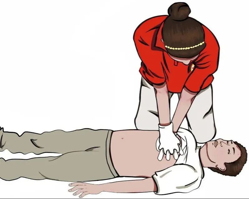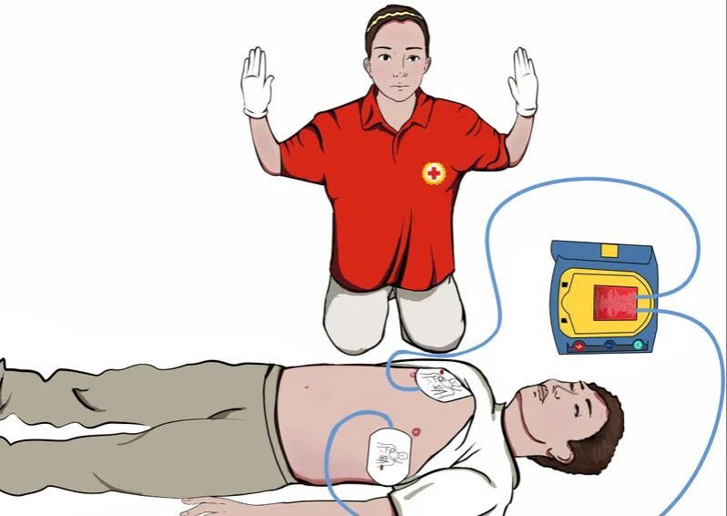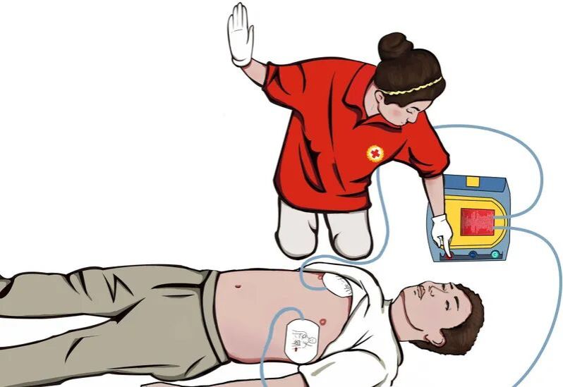 5.按压:电击除颤完成后,无需关闭AED。立即进行胸外按压、人工呼吸,持续进行心肺复苏。AED会自动再次分析心律,重复上述流程,直至患者恢复自主呼吸、脉搏,或专业急救人员到达接手。