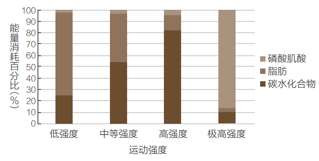 运动强度越高,碳水化合物消耗越多,运动强度越低,脂肪消耗越多。而在运动强度特别高的时候,磷酸肌酸供能的比例就会非常大。(图1)蛋白质作为能量物质利用的比例一般很小。