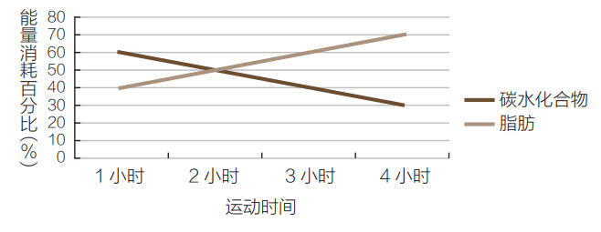 能量物质的利用还跟运动时间有关,运动时间越长,脂肪消耗的比例越大,糖类消耗比例越小。(图2)