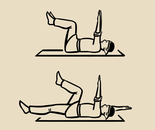 仰卧,双膝屈曲 90 度,双臂向上伸直,腰部全程贴于地面。缓慢同时移动对侧的腿和手臂,双侧交替。