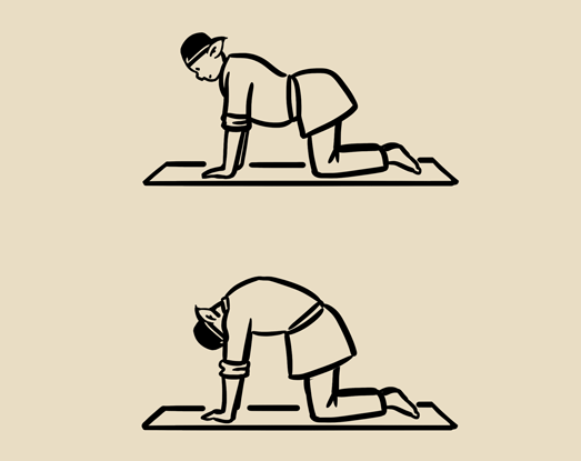 吸气时,臀部向上翘起,头前伸,使脊背伸直;呼气的同时,腹部收缩,背部顺势上扬,像猫咪一样弓起背部。
