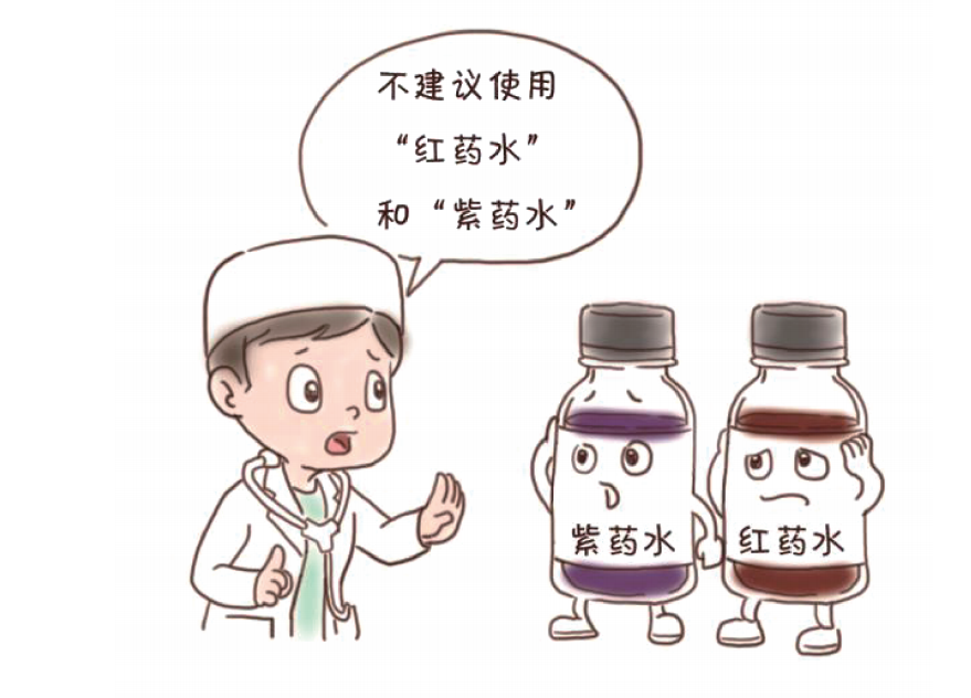 汞溴红溶液,就是我们俗称的“红药水”,因含有汞这种重金属,对人体有害,现在已不建议使用。龙胆紫溶液,俗称“紫药水”,因为容易导致痂下的伤口愈合不良,且对人体有致癌性,现在也不建议使用。而且这两种药水都容易引起伤口颜色改变,影响伤口的观察,因此不建议使用“红药水”和“紫药水”。
