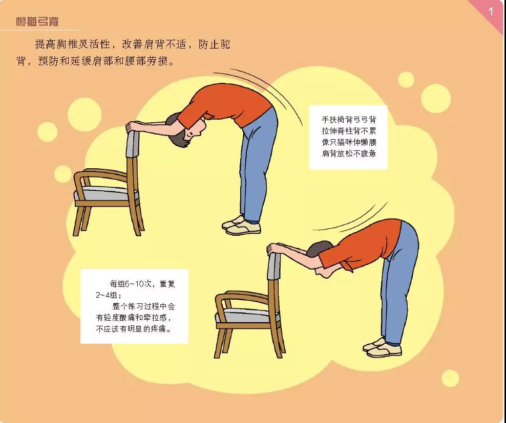 动作要点:双手扶着椅背,弓背,之后放松。整个练习过程中应有轻度酸痛和牵拉感,不应该有明显的疼痛。