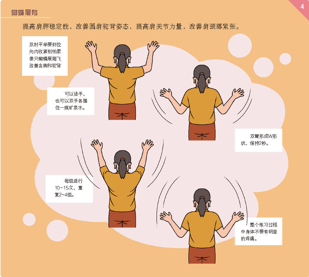 动作要点:可以徒手,也可以双手各握住一瓶矿泉水。双臂形成W形状,保持2秒。双臂上举,保持2秒,重复进行,注意不应有明显的疼痛。