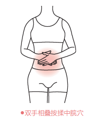 日常保健按摩手法:取仰卧位,将两手手掌相贴,用力快速搓动,当手掌极热时,双手相叠,迅速覆盖于中脘穴上,顺时针和逆时针交替揉动10分钟。