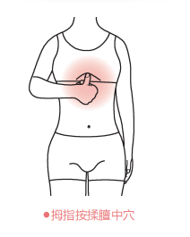 日常保健按摩手法:用一手拇指或中指螺纹面着力,置于膻中穴上,其余四指轻抚体表或抱空拳,腕关节轻轻摆动或小幅度环旋转动,使着力部位带动该处的皮下组织做反复不间断、轻柔和缓、有节律地回旋揉动