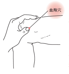 日常保健按摩手法:坐在椅子上,将腿伸展绷直,在膝盖内侧会出现一个凹陷的地方,在凹陷的上方有一块隆起的肌肉,肌肉的顶端就是血海穴。用两手拇指重叠按压这个穴位,至酸胀为宜,多按压几次,缓解痛经的效果会更好。