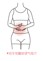 日常保健按摩手法:取仰卧位,两手手掌相贴,用力快速搓动,当手掌极热时,双手相叠,迅速覆盖于气海穴上,顺时针揉动约10分钟。