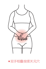 日常保健按摩手法:取仰卧位,两手手掌相贴,用力快速搓动,当手掌极热时,双手相叠,迅速覆盖于关元穴上,顺时针揉动约10分钟。