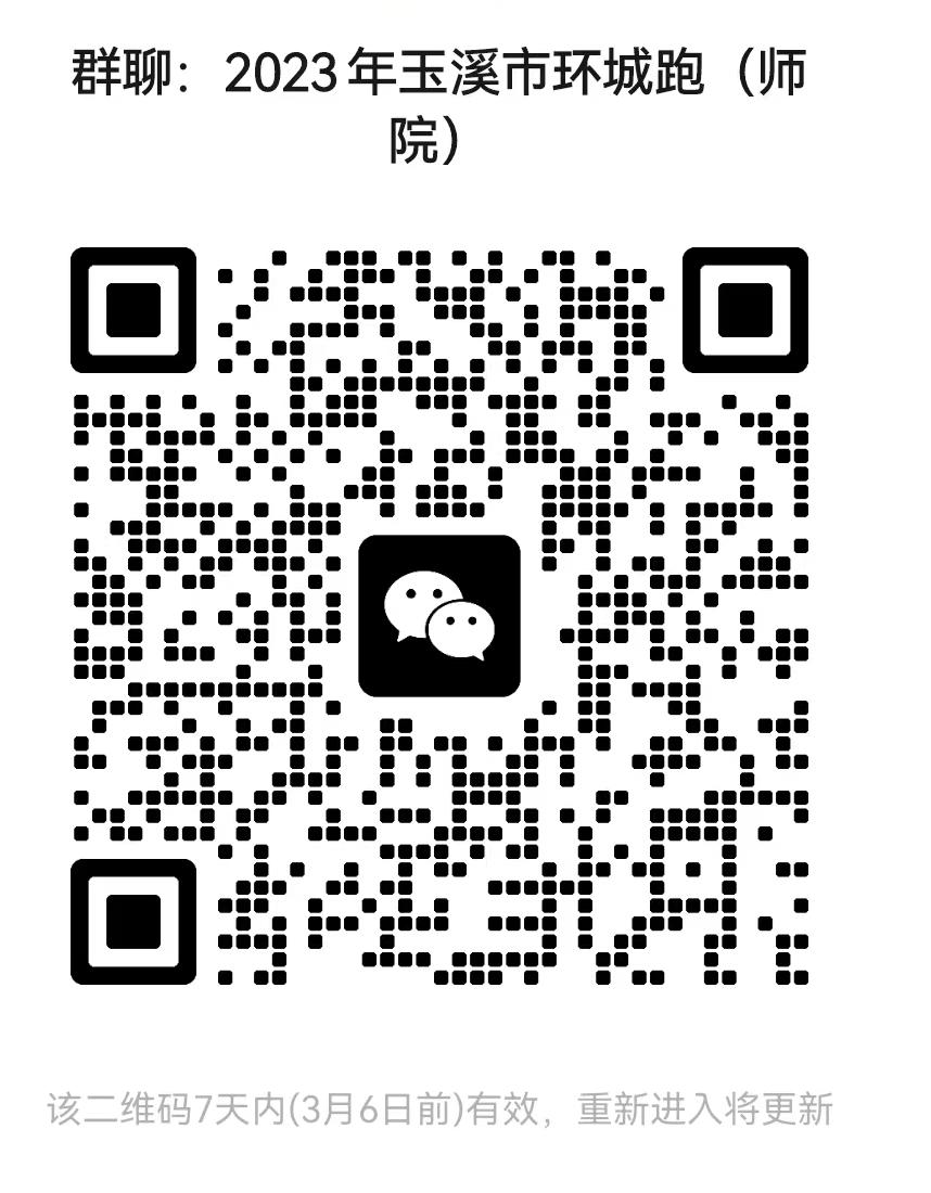 二、参赛报名方式:请身体健康且愿意参加本次活动的教职工于2023年3月3日前扫码进“玉溪师院环城跑”微信群,环城跑相关事宜在群内通知,参赛者需签“自愿参赛责任书”(《自愿参赛责任书》于3月3日在环城跑起点现场签字)。