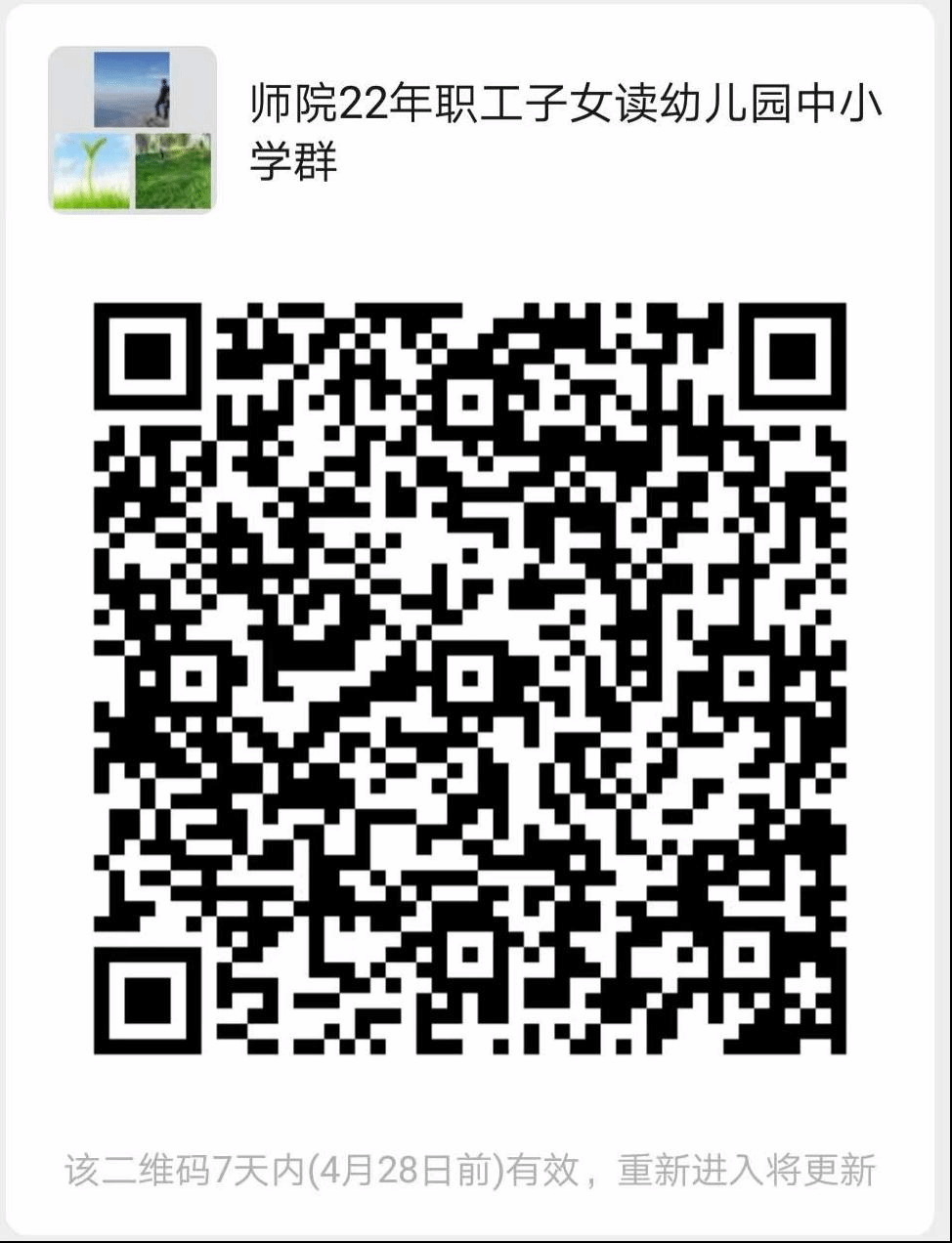 凡2022年有子女要就读幼儿园、中小学的教职工,请尽快扫码加入微信群“师院22年职工子女读幼儿园中小学群”,并按相应要求填报,孙子辈及编外职工子女请在相应表格的备注栏中注明,校工会具体负责入学相关事宜联系人周菊琼,联系电话:680098、2054848(表格附后)。