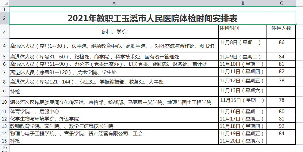 2、玉溪市人民医院健康体检中心体检时间:2021年11月8日—11月20日,玉溪市人民医院健康体检中心周六不休息,请报名玉溪市人民医院的教职工带本人第二代身份证按照《体检时间安排表》到体检中心体检。若安排的时间有课、出差、有事的老师可以在11月13日、20日(星期六)进行补检。