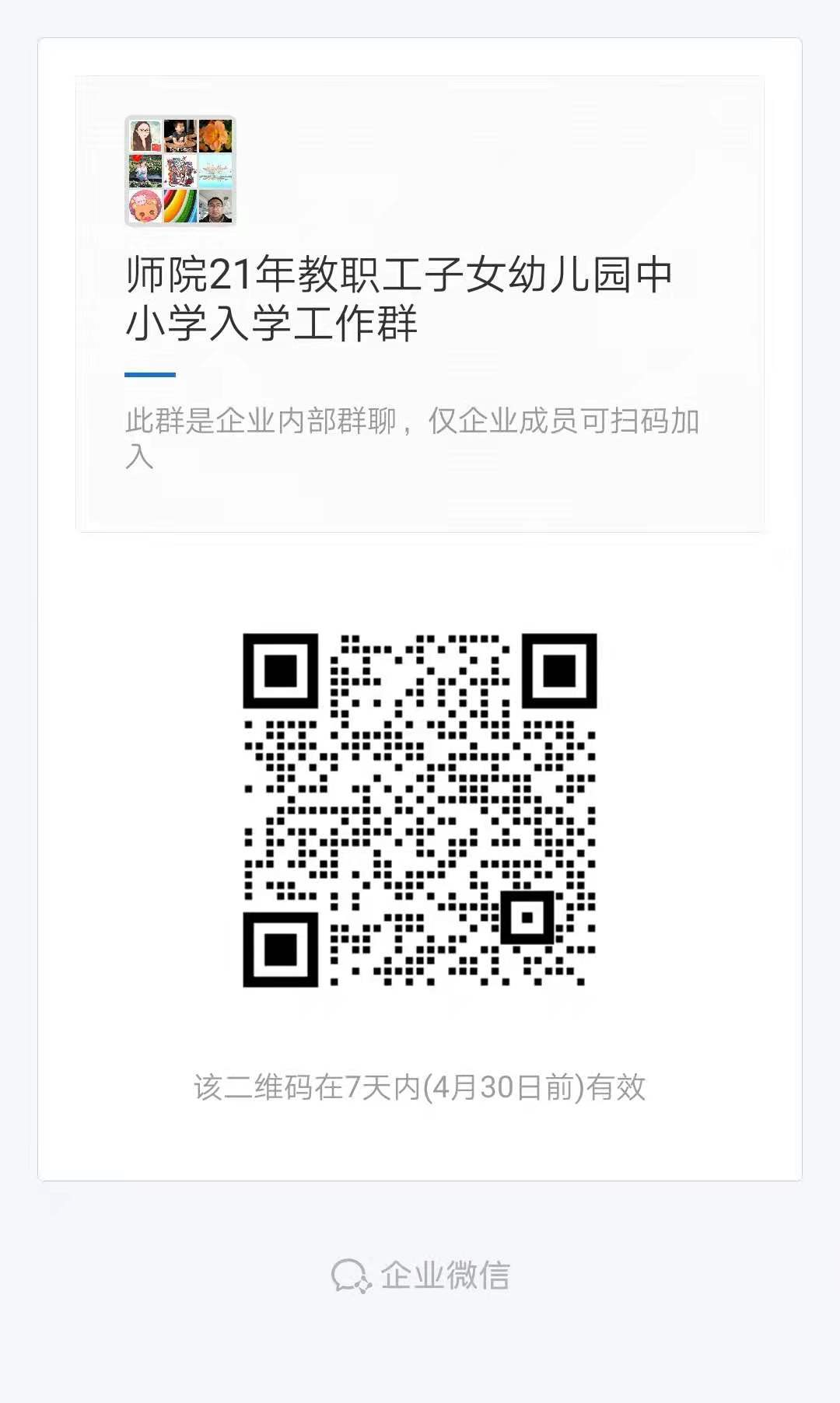 自《玉溪市红塔区2021年义务教育学前教育招生入学相关规定》出台后,每天工会都能接到数位职工电话,鉴于各位职工的担忧,校工会决定在接到中小学正式通知前进行校内预报名,凡2021年有子女要就读中小学的教职工,请尽快扫码加入企业微信群“师院21年教职工幼儿园中小学入学工作群”,并于5月1日前将《红塔区2021年一年级新生入学预登记表(中小学用表)》、《预报名信息登记表(中小学用表)》提交至企业微信群或周菊琼邮箱zjq@yxnu.edu.cn;后续就读事宜将直接对接报名职工。校工会具体负责入学相关事宜联系电话:2054848。请各基层工会主席通知到需入学的每一位会员。(报名表见附件)