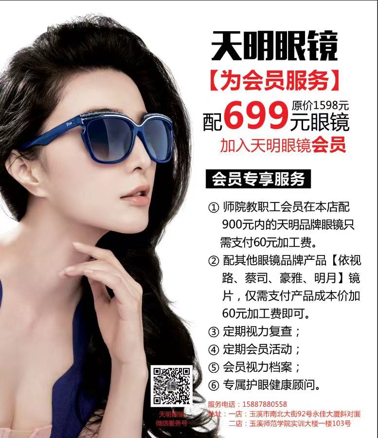 天明眼镜店已在我校经营十五年,一直为广大师生员工热心服务,为解决玉溪师范学院教职配镜贵,戴镜久、戴镜单一的问题为回馈师生员工,天明眼镜店针对学校教职员工开展配镜优惠活动。具体优惠内容如下: