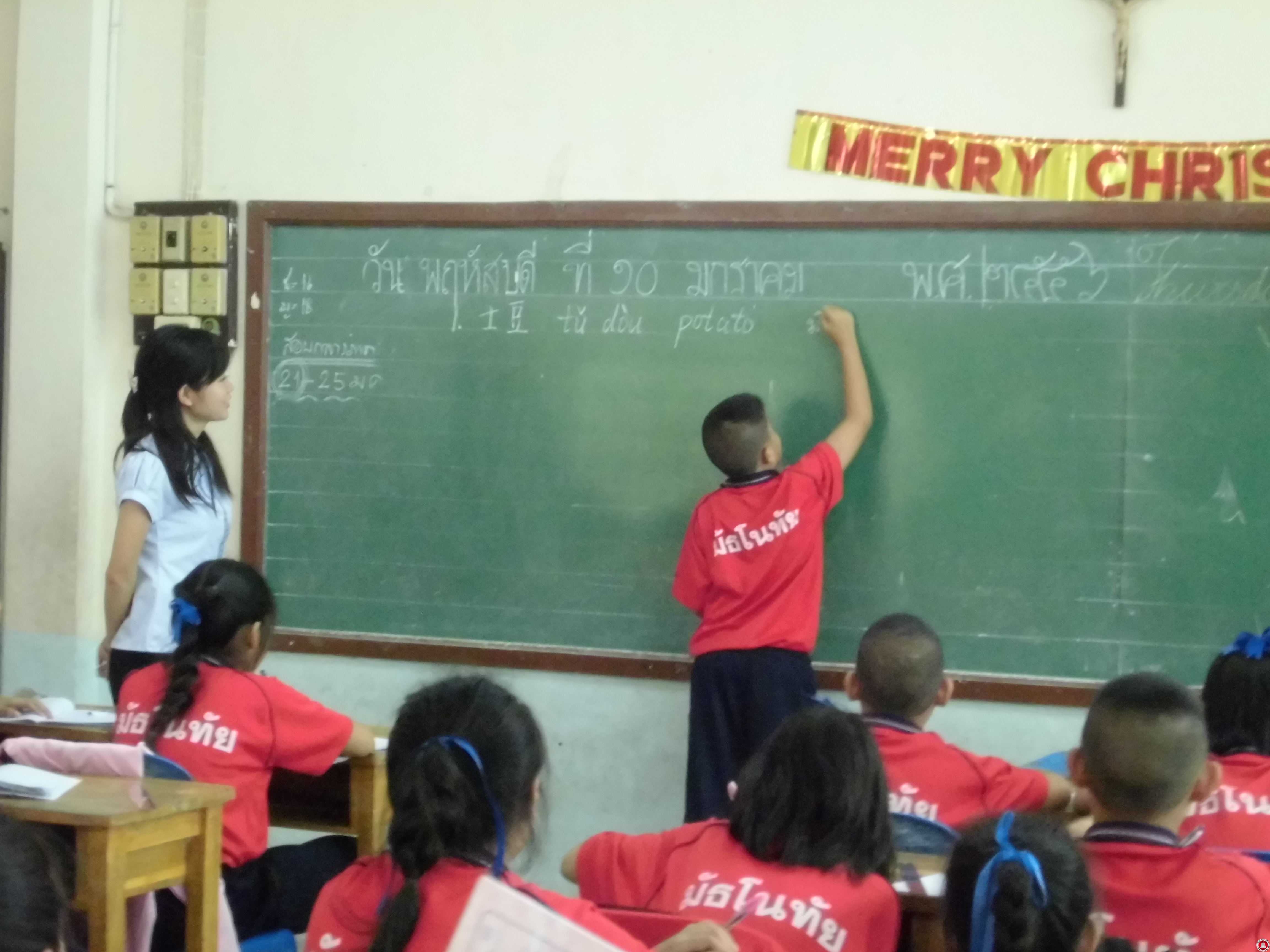 第一周,我跟着老师去听课,熟悉并掌握泰语的课堂用语以及不同年级的教学方法。一个周下来,我发现,这里的学生在课堂上都很随意。不像我当年上学一样,整节课都是规规矩矩地坐在座位上,不敢有一丁点儿马虎。他们则不是这样,他们觉得你上课有趣或者喜欢你,就专心的听课。如果觉得内容枯燥乏味就干自己的事(睡觉、四处走动、说话等),完全无视你的存在。此外,不同年级的学生要用不同的教学方法(小学生的课堂,老师得像个孩子;初中生的课堂,老师得像哥哥姐姐;高中生的课堂,老师得像他们的朋友)。跟着老师去听课,我不单是去发现问题,去学习泰语,我还得在听课中寻找解决方法。我观察每个班学生的性格特点,做好记录,通过他们的性格特点,制定出我的上课管理策略。再根据学生们上课的情况,确定每节课学生所能够接受知识容量,从而做好备课工作。