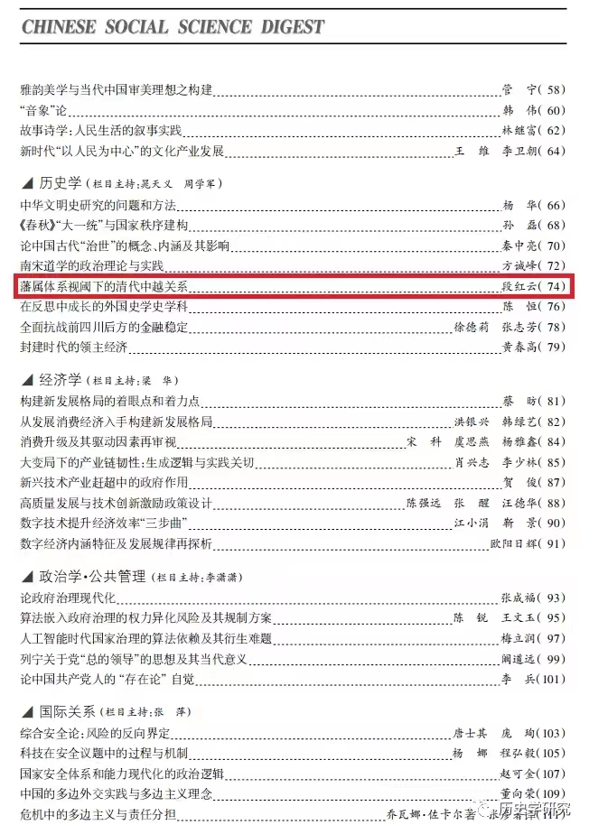 近日,《中国社会科学文摘》2023年第5期全文转载了我校段红云教授的学术论文《藩属体系视阈下的清代中越关系》。该文发表于《史学集刊》2023年第1期。