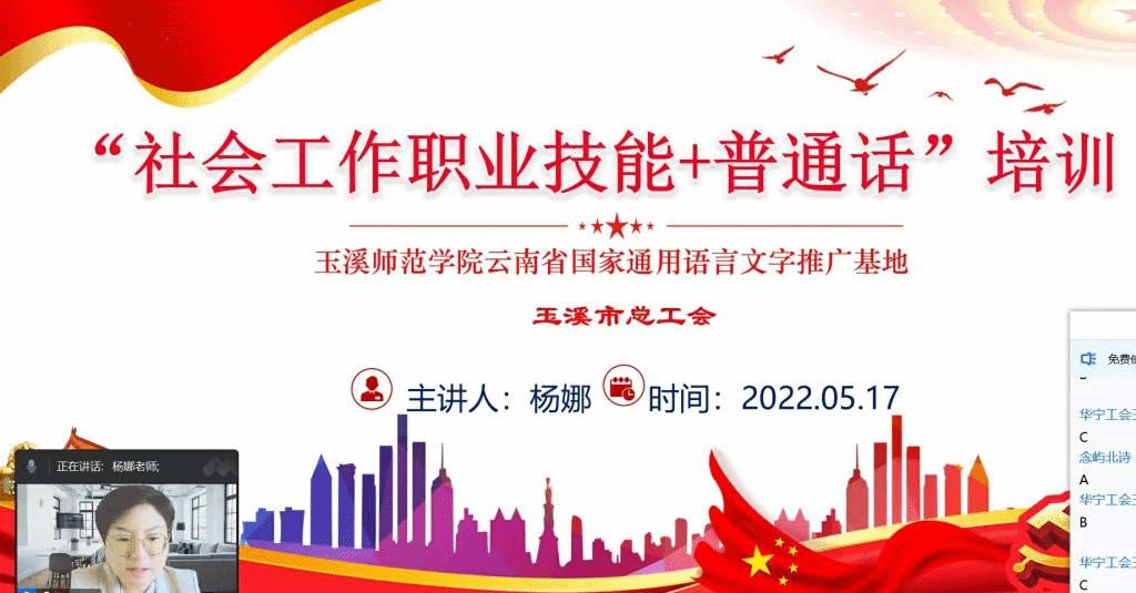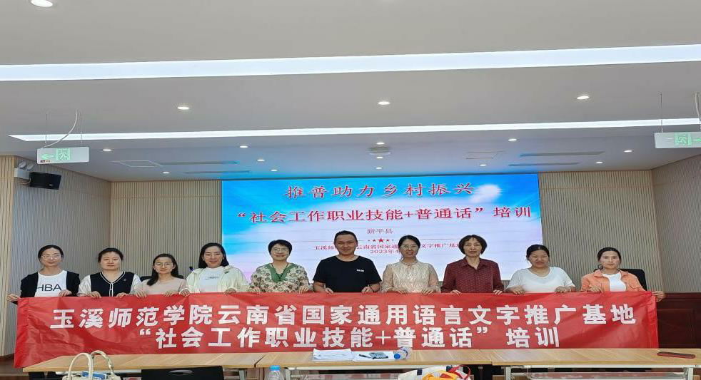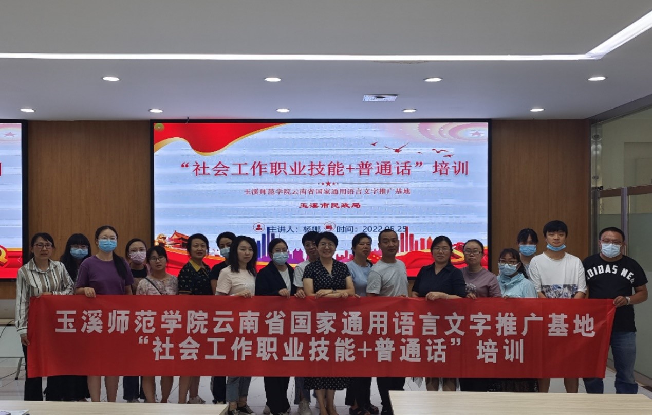 为认真落实省语委、省教育厅的文件精神,积极参与实施国家通用语言文字普及提升工程和推普助力乡村振兴计划,今年4-5月,我校云南省国家通用语言文字推广基地成员和法学院社会工作专业教师采用线上线下相融合的方式,先后与新平县总工会、玉带路街道、玉溪市总工会、玉溪市民政局校地联动开展了四期“社会工作技能+普通话”培训,共500余名来自一线的社会工作者参加了培训。