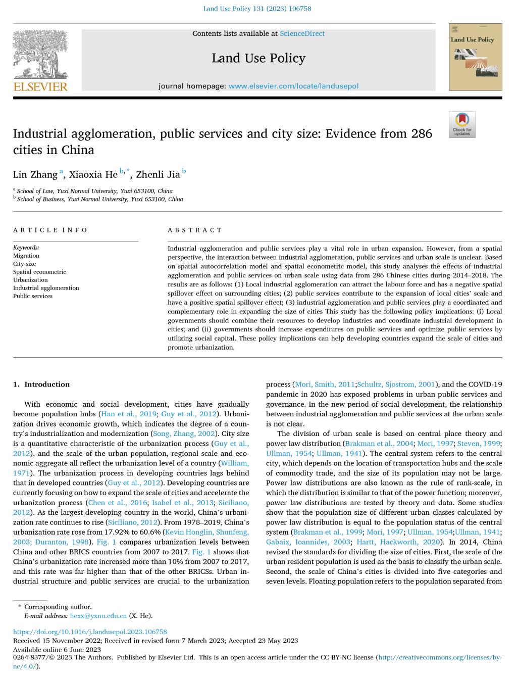 玉溪师范学院法学院博士、副教授章林与商学院博士、教授何晓夏合作,2023年6月6日在Land Use Policy发表题为“Industrial agglomeration, public services and city size: Evidence from 286 cities in China”的学术论文,是我校国家金融安全创新团队和普惠金融创新团队的重要阶段性成果。商学院博士、副教授贾振立为论文第二作者。