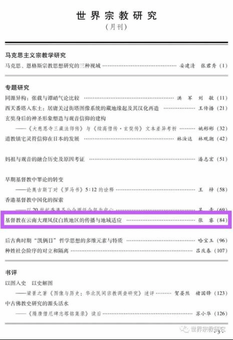 近日,玉溪师范学院外国语学院教师张睿博士独立撰写的学术论文《基督教在云南大理凤仪白族地区的传播与地域适应》发表在《世界宗教研究》2023年第5期。该论文也是张睿博士近两年来以玉溪师范学院为第一单位在该期刊发表的第2篇学术论文。