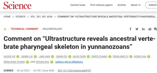 7月28日,玉溪师范学院副教授陈爱林与西北大学、中国地质大学(北京)古生物研究团队联合研究的专题学术评论《Comment on “Ultrastructure reveals ancestral vertebrate pharyngeal skeleton in yunnanozoans”》(对“云南虫的超微构造揭示出其祖先脊椎动物咽骨”的评述)在国际著名学术期刊Science发表。该文对有学者2022年在《科学》发表论文的核心观点“云南虫是脊椎动物干群或原始脊椎动物”进行了剖析和否定。