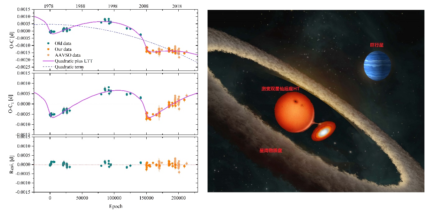 资料图:左图显示由于星周物质盘和巨行星伴星的存在,仙后座HT的轨道周期呈现出快速衰减(蓝色虚线)和周期性振荡(玫红色实线)。右图是由激变双星仙后座HT及其星周盘和巨行星伴星构成的特殊系统想象图。