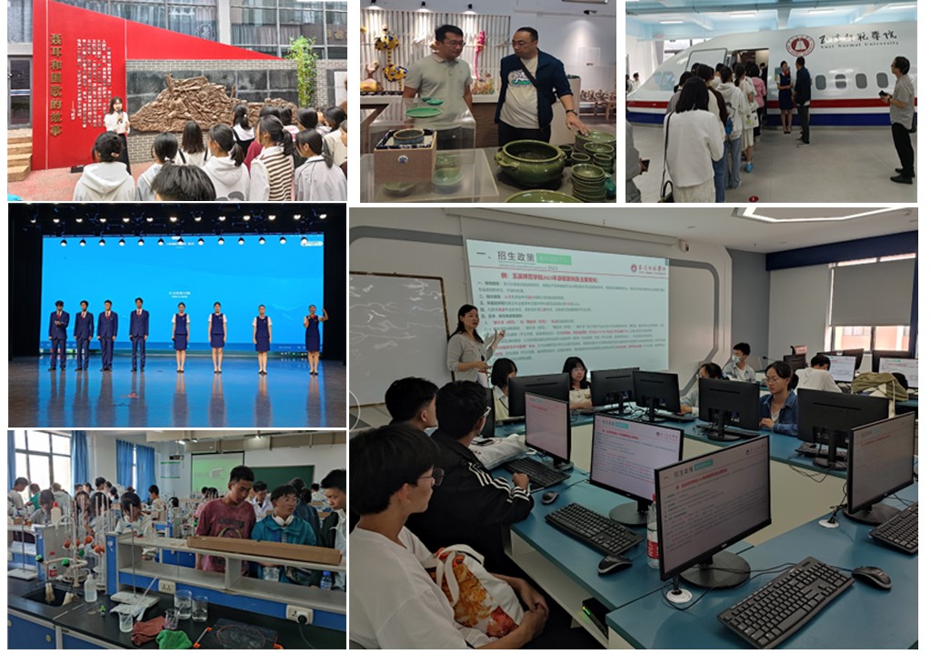 在玉溪师范学院副校长章新,教务处处长安镇宙、副处长李学孺带领下,澄江一中师生们参观了文学院红塔书院、聂耳与国歌研究院、湄公河次区域民族民间文化传习馆、音乐学院空乘专业实训基地、美术学院展览走廊、云南省智慧城市网络空间安全重点实验室等场地,在音乐学院三楼小剧场观看了学校精心组织的学生活动展示,在数学与信息技术学院专业机房了解了学校招生情况,在化学生物与环境学院学生实验工坊现场体验了趣味实验手工皂制作。