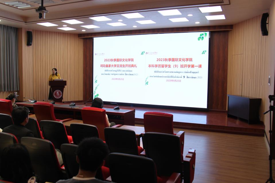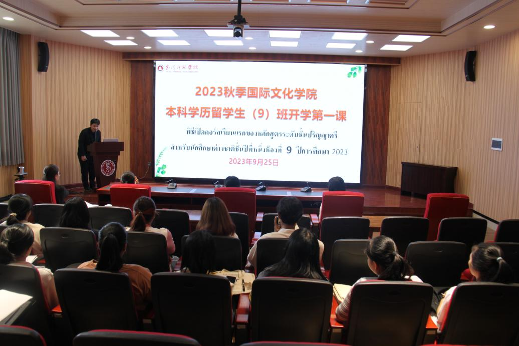 25日上午,国际文化学院为泰国呵叻皇家大学校际交流生、2023级本科学历留学生举行开班典礼暨开学第一课活动。国际文化学院院长杨春、副院长周朝润,班主任彭乐杉、办公室主任白媛、教学科科长葛丽、事务科科长张玲玲出席,周朝润主持。